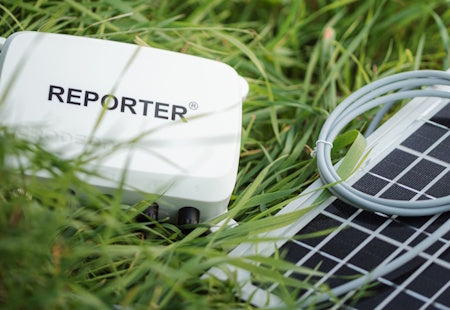 For applications in remote areas you can power your Reporter with a small solar panel (dimensions: 35cm x 25cm). This way Reporter has everything on board to charge during the day and easily survive multiple nights without sunlight, even when operating at a low measurement interval.